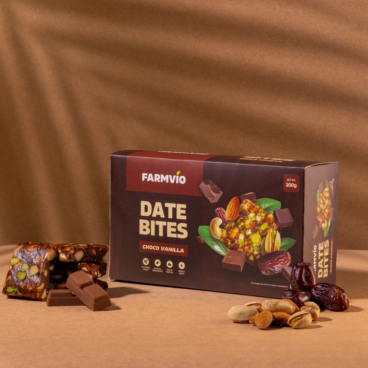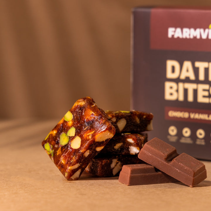 Enjoy the rich blend of chocolate and vanilla with Farmvio Choco Vanilla Date Bites – a guilt-free indulgence that powers your day.